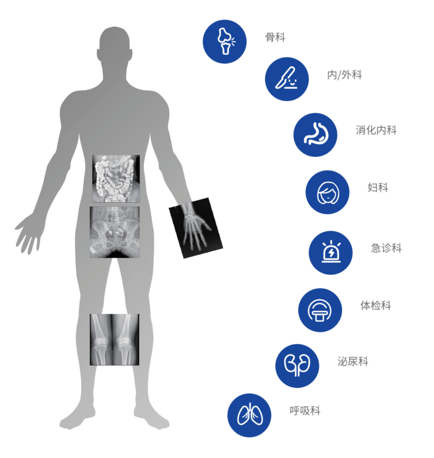 動態DR集常規拍片、胃腸、透視、造影于一體,可應用于臨床各科室,如體檢科、內科、外科、骨科、急診科等,臨床用途更加廣泛。