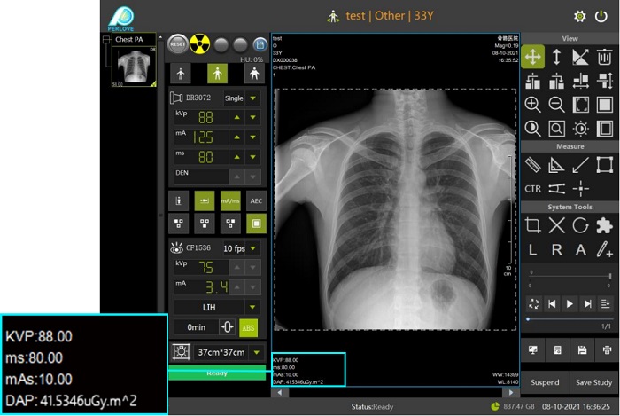 DAP是指射線累計劑量與照射面積的乘積值,表示照射人體的射線總數。由于醫護人員受到的輻射照射來自主射線束穿過患者時產生的二次射線。因此,醫護人員受到的射線劑量和患者的DAP緊密相關。搭配DAP輻射劑量監控系統,可以在圖像上實時顯示單次曝光的劑量強度,便于醫生掌握輻射情況,有效控制劑量攝入,為醫患提供更多健康呵護。