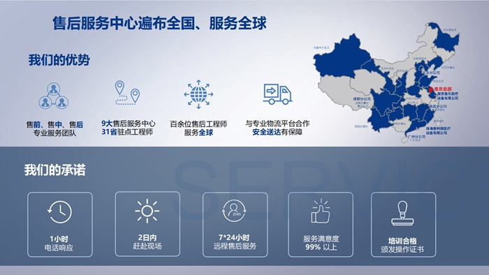 普利德醫(yī)療構(gòu)建了覆蓋全國的售前、售中及售后服務(wù)體系,提供電話、網(wǎng)絡(luò)咨詢以及上門維護(hù)、維修等服務(wù)。售后工程師均經(jīng)過專業(yè)培訓(xùn)、持證上崗,實(shí)現(xiàn)本土化服務(wù),7*24 小時高效響應(yīng)客戶需求,切實(shí)踐行“一切為客戶創(chuàng)造價值”的核心價值觀。